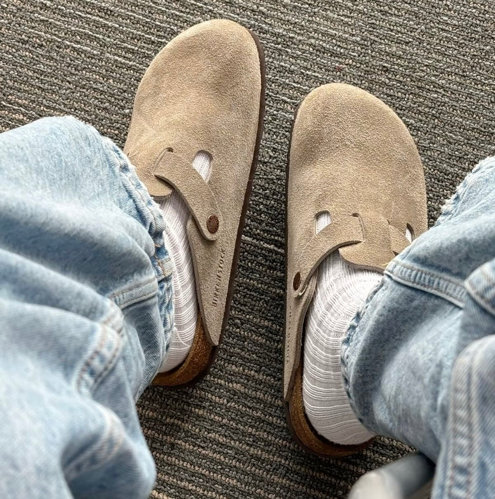Birkenstock Boston Suede Leather Soft Footbed in Taupe